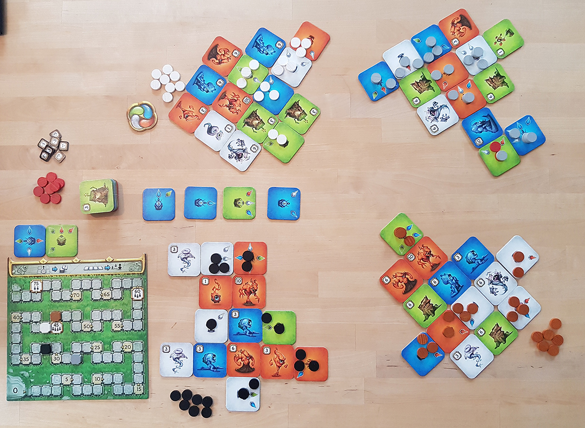 Das Spiel ist ein Wettrennen und wird immer spannender. Gerade am Spielende ergeben sich schonmal Spielzüge, die 20 Punkte bringen und wenn man bei vier Spielern 75 Punkte erreichen muss, um das Spielende einzuläuten, dann so sieht man, wie schnell es zuletzt plötzlich gehen kann oder wie weit man mit dem letzten Zug noch aufholen kann. Dass es einen gewissen Glücksfaktor gibt, welche Plättchen gerade ausliegen ist nicht störend. Man muss eben damit umgehen. Mit Spielerfahrung lernt man immer besser, die Plättchen bei der Ablage geschickt zu kombinieren, um mit einem gelegten Plättchen gleich mehrere erfüllen zu können.