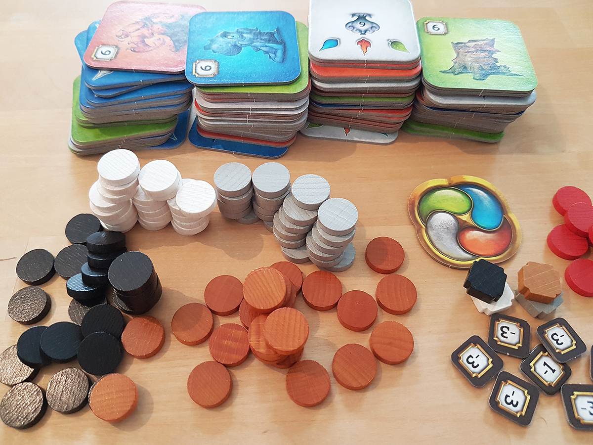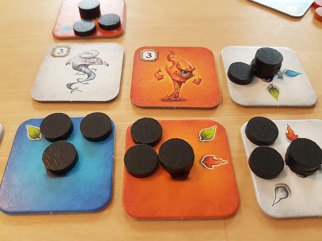Was ist denn zu tun in diesem Spiel, dass die Monsterchen einem die wichtigen Siegpunkte bringen? Es ist ein Legespiel. Dabei werden vom Nachziehstapel fünf Plättchen aufgedeckt. Anschließen muss man reihum ein Plättchen nehmen und es in seine eigene Anlage legen. Auf den Plättchen ist ein Gefäß abgebildet, in dem einer dieser putzigen Geister wohnt. Außerdem sind ein bis vier farbige Symbole an den Ecken bzw. Kanten abgebildet. Je nach Anzahl dieser Symbole legt man nun entsprechend viele seiner „Klangscheiben“ (kleine Holzscheiben in seiner Farbe) auf das Plättchen. Liegen in der Richtung, in die die Symbole zeigen, ein entsprechend farbiges Plättchen, darf man dieses Symbol mit den gelegten Scheiben abdecken. Werden im Laufe des Spiels alle Symbole abgedeckt, darf man alle Scheiben zurück in seinen Vorrat nehmen und das Plättchen umdrehen. Das heißt, der Naturgeist kommt aus seinem Gehäuse und bringt die Punkte mit, von denen man am Ende die meisten haben sollte.