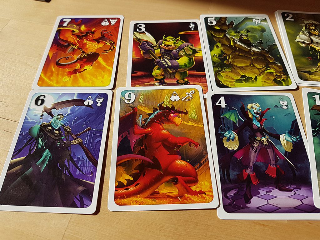 Klingt zunächst mal ziemlich simpel. Spielt sich ja auch so. Aber das richtig fiese an dem Spiel ist, dass jeder Spieler ständig entscheiden muss, ob er ein mächtiges Monster ins Verlies legt, dass der Held wohl nicht mehr besiegen kann, dann sollte der Spieler aber nicht der letzte sein, der nicht passt. Hat der Held seinen Drachentöter schon verloren und legt ein Spieler dann den Drachen ins Verlies, wird wohl jeder andere Spieler nach ihm passen und er selbst muss hinein.