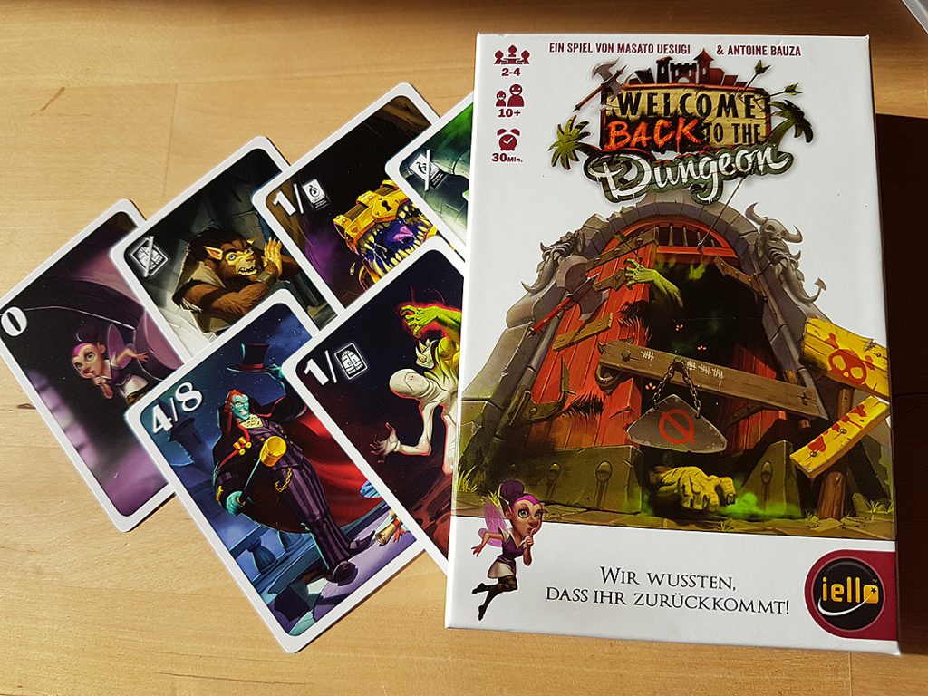 „Welcome to the Dungeon“ von Masato Uesugi von iello ist ein einfaches Bluffspiel für 2-4 Personen ab 10 Jahren. Man zieht Monsterkarten, um diese entweder in das Verlies zu legen oder abzuwerfen. Dafür nimmt man dem Helden eine seiner Ausrüstungen. Oder man passt. Wer zuletzt nicht gepasst hat, muss nun den Helden mit der verbliebenen Ausrüstung nehmen und sich der Reihe nach den Monstern im Verlies stellen. Schafft er es, erhält er eine Erfolgskarte, bei zwei Karten hat er gewonnen. Schafft er es zweimal nicht, ist er endgültig aus dem Spiel ausgeschieden.