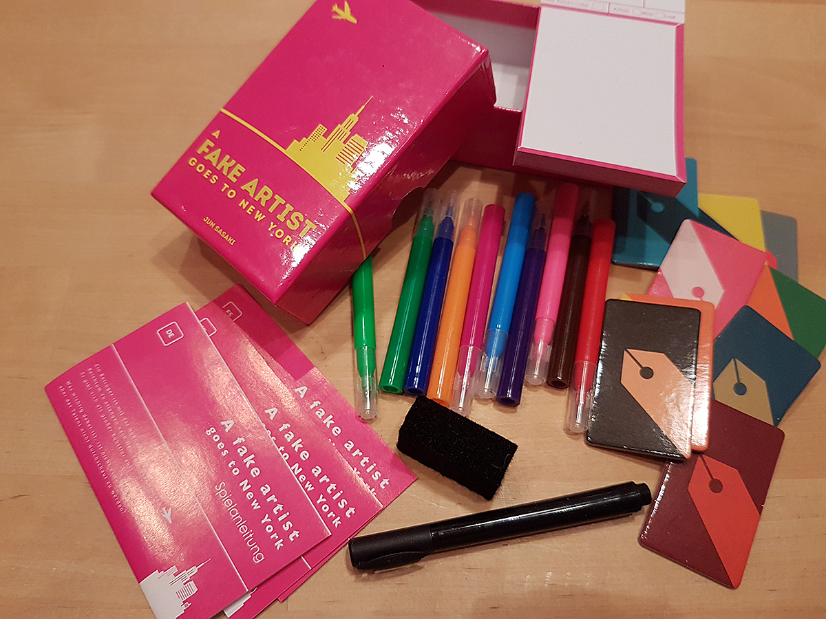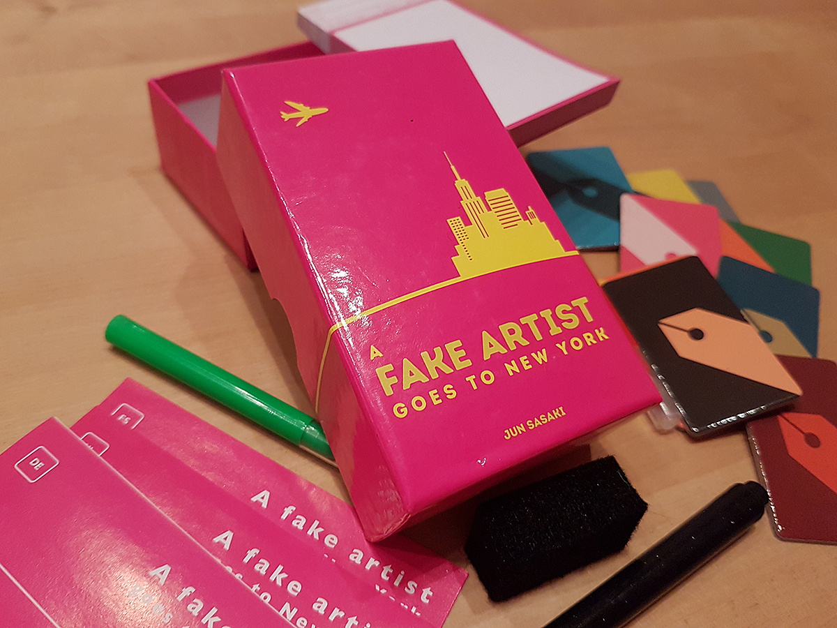 A fake artist goes to New York von Jun Sasaki für 5 bis 10 Spieler ab 8 Jahren, erschienen bei Oink Games 2012, ist ein Deduktionsspiel mit Zeichenelement. Man zeichnet gemeinsam an einem Kunstwerk, nur ein Mitspieler, der „fake artist“ weiß nicht, was gezeichnet wird. Die Aufgabenstellung ist für die Künstler, den „fake artist“ zu entlarven oder für den falschen Künstler, zu erraten, was gezeichnet werden soll.