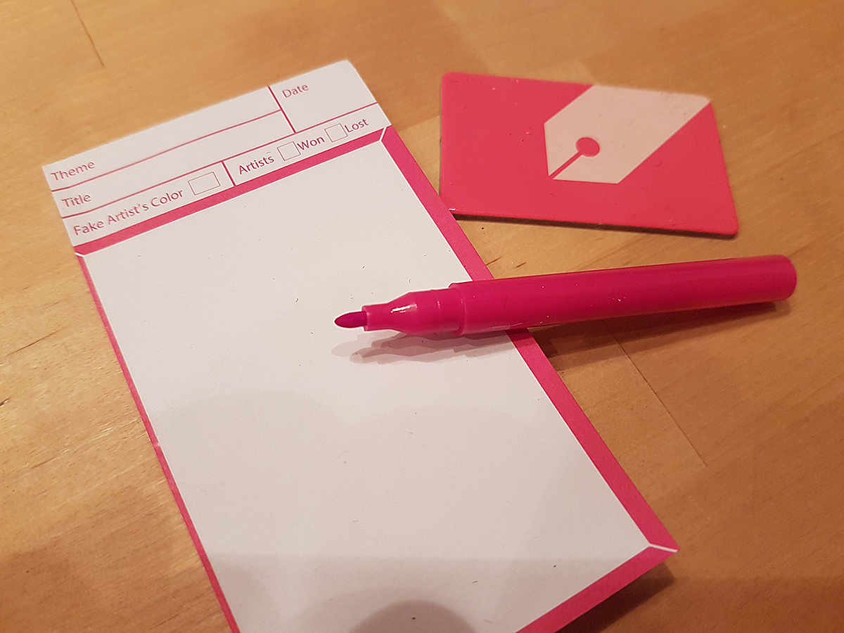 Das Material ist in Ordnung, wenn man berücksichtigt, dass alles Material in einer 11 x 6 cm kleinen Schachtel untergebracht ist. Oink Games hat es mal wieder geschafft und die Schachtel perfekt gefüllt. Die zehn Stifte sind klein aber gut, die Beschriftung funktioniert und mit einem speziellen Löschstift lassen sich die Karten auch wieder sauber abwischen. Für das Zeichnen bei größeren Gruppen sollte man sich aber einen größeren Block nehmen, damit alle am Tisch sehen, was passiert.