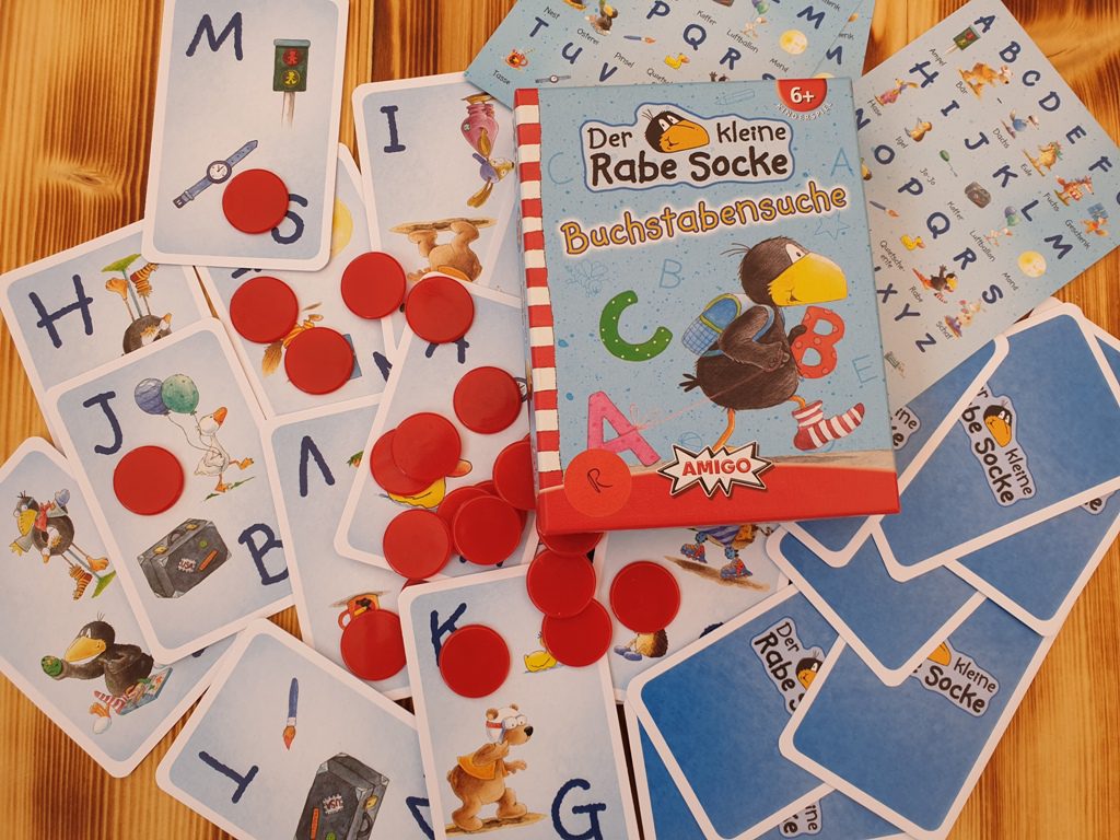 Beide Spiele kommen wie immer in gewohnter Amigo-Qualität und bestehen aus stabilen Karten, so dass auch Kinderhände gut damit zurechtkommen. Die grafische Umsetzung gefällt den Kleinen natürlich besonders gut, da Der kleine Rabe Socke nach wie vor hoch im Kurs ist. Bei der Buchstabensuche sind die Bilder nicht gleich einem Anfangsbuchstaben zuzuordnen, doch die mitgelieferte Übersichtskarte schafft Abhilfe.