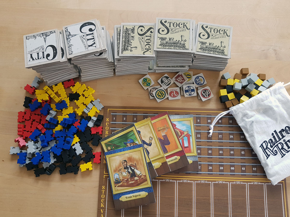 Railroad Rivals von Glenn Drover, Grafiken von Jacoby O´Connor und Mark Page, für 1 bis 5 Spieler ab 8, erschienen bei Forbidden Games 2018, ist ein Auktions- und Legespiel, das in jeder Besetzung Spaß macht und zugleich fordert. Grübeln muss man, aber überfordert wird man im Spiel nicht. Die Auktionen sind spannend, der Aufbau des Gleissystems und der damit verbundenen Lieferwege hat seine Kniffe. Das Spiel bleibt spannend bis zuletzt und überzeugt nicht nur durch das hervorragende Material und die schlichte aber spielfördernde Grafik.