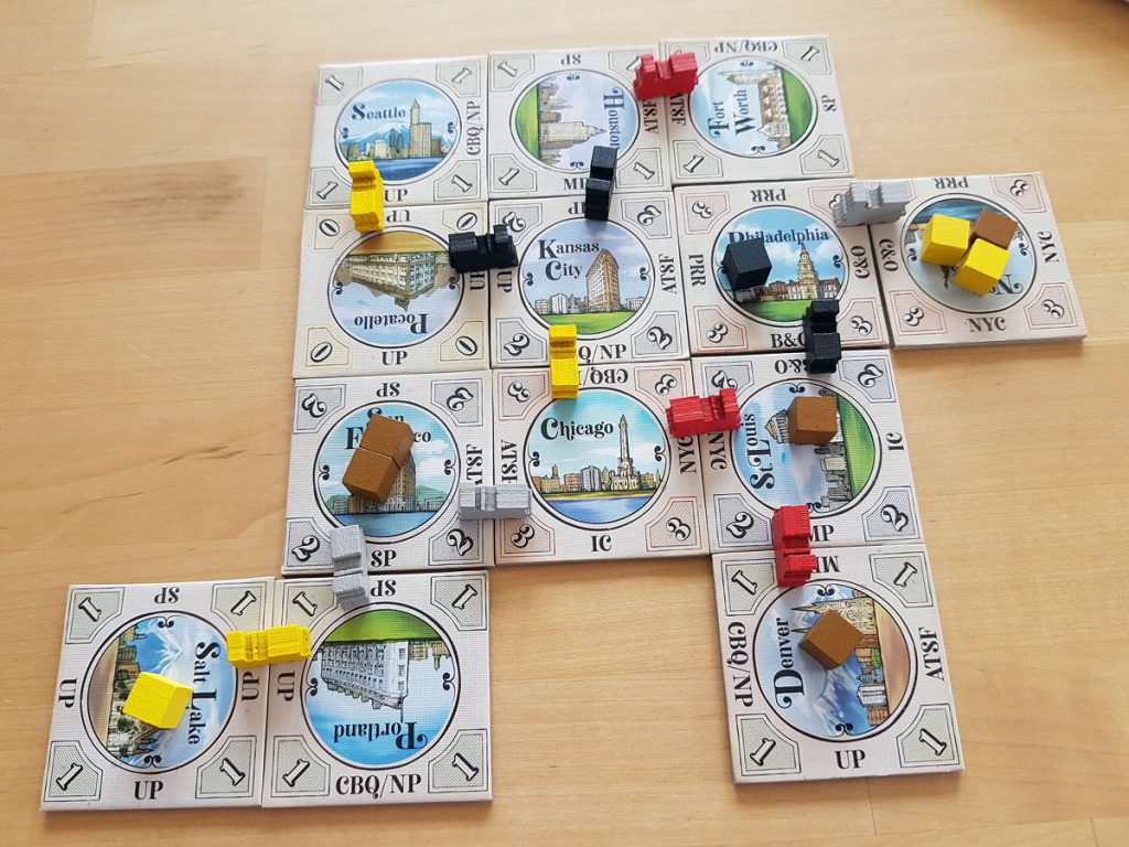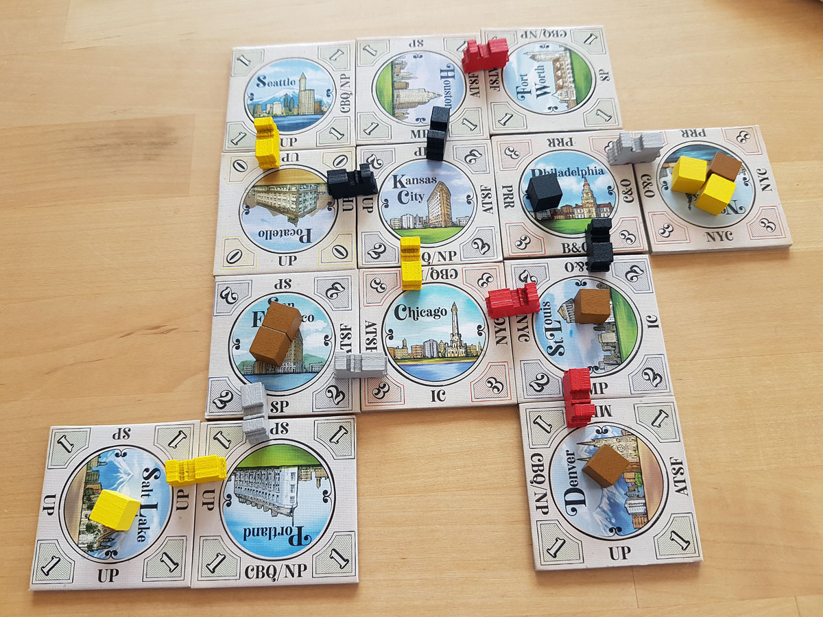 Die Städte legt man nun an das bereits bestehende Gleissystem an. Dabei entstehen Verbindungen, die der Spieler mit seiner Farbe markiert. Werden irgendwann Waren über diese Verbindung von einer Stadt in die andere geliefert, erhält die zugehörige Bahngesellschaft einen Punkt und wird damit aktientechnisch gesehen wertvoller. Punkte erhält ein Spieler durch die Lieferung von Waren, die auf den Städten liegen.