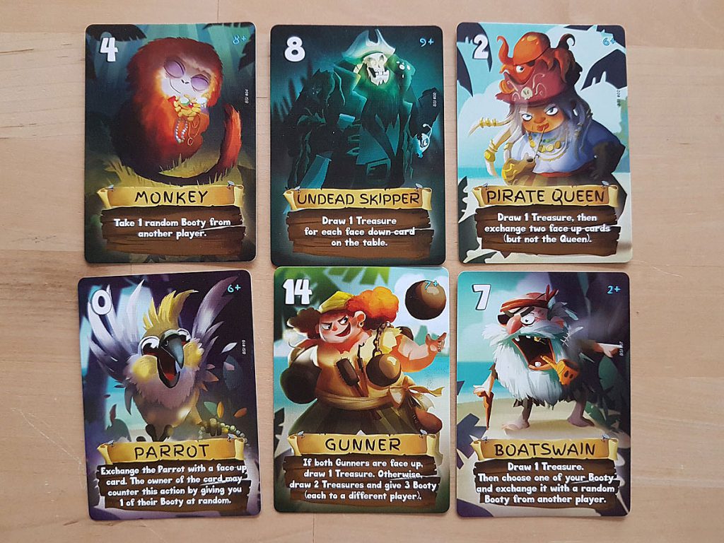 Hört sich zunächst einfach an. Kann denn darin soviel Spiel stecken? Ja, tut es. Natürlich kein aufwändiges strategisches Brettspiel. Aber wer Love Letter kennt, weiß, was ihn erwartet. Da gilt es zu taktieren, den Mitspieler abzuschätzen, Pokerface aufsetzen, zocken. Die Karten mit ihren unterschiedlichen Aktionen wollen zunächst einmal kennengelernt werden. Welche Kombinationen ergeben sich, welche Karten sollten nicht aufeinander treffen, wie kann ich meine Karten gegen andere tauschen, wie erbeute ich viele Schatzkarten, wie mache ich den anderen das Leben schwer.